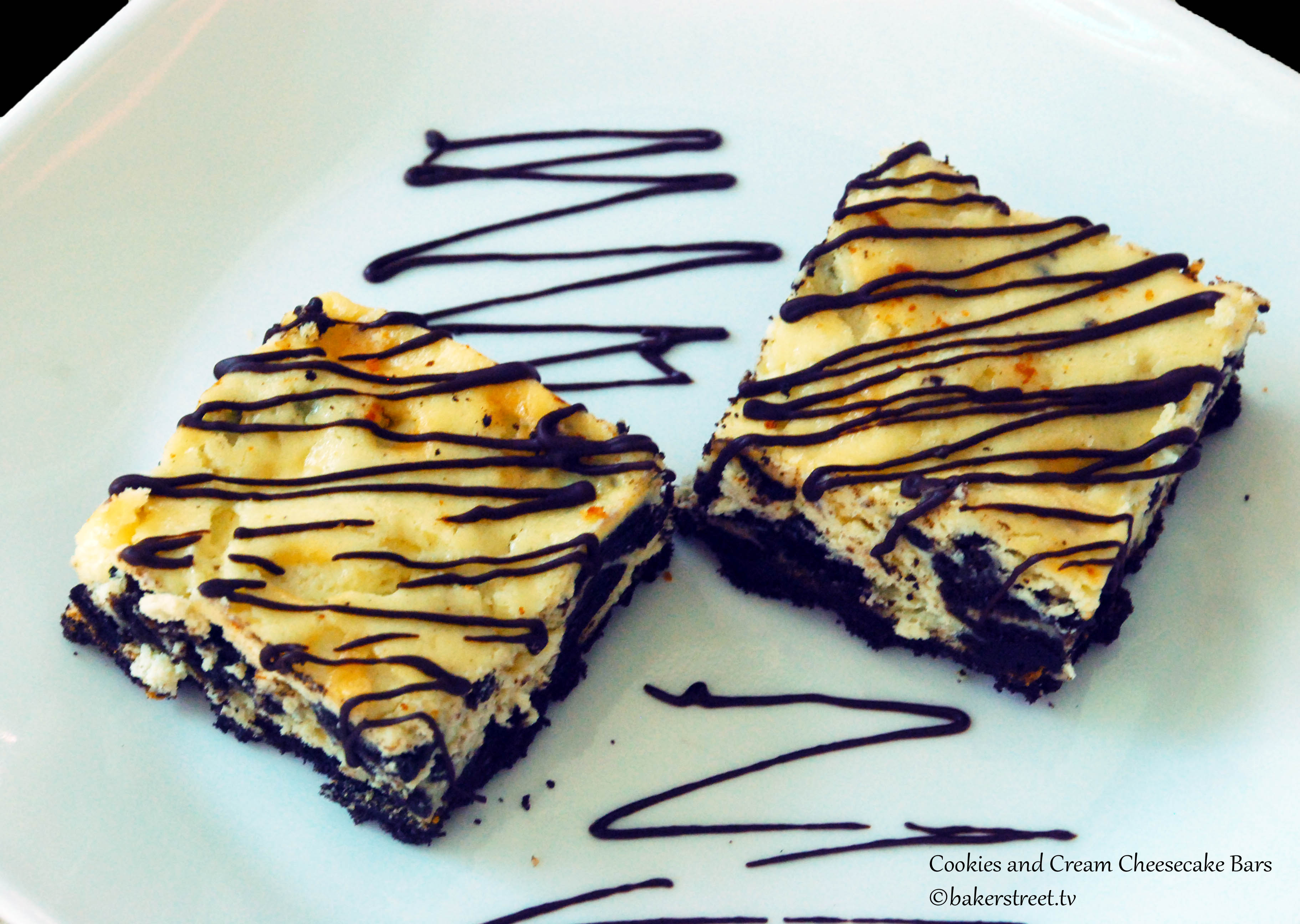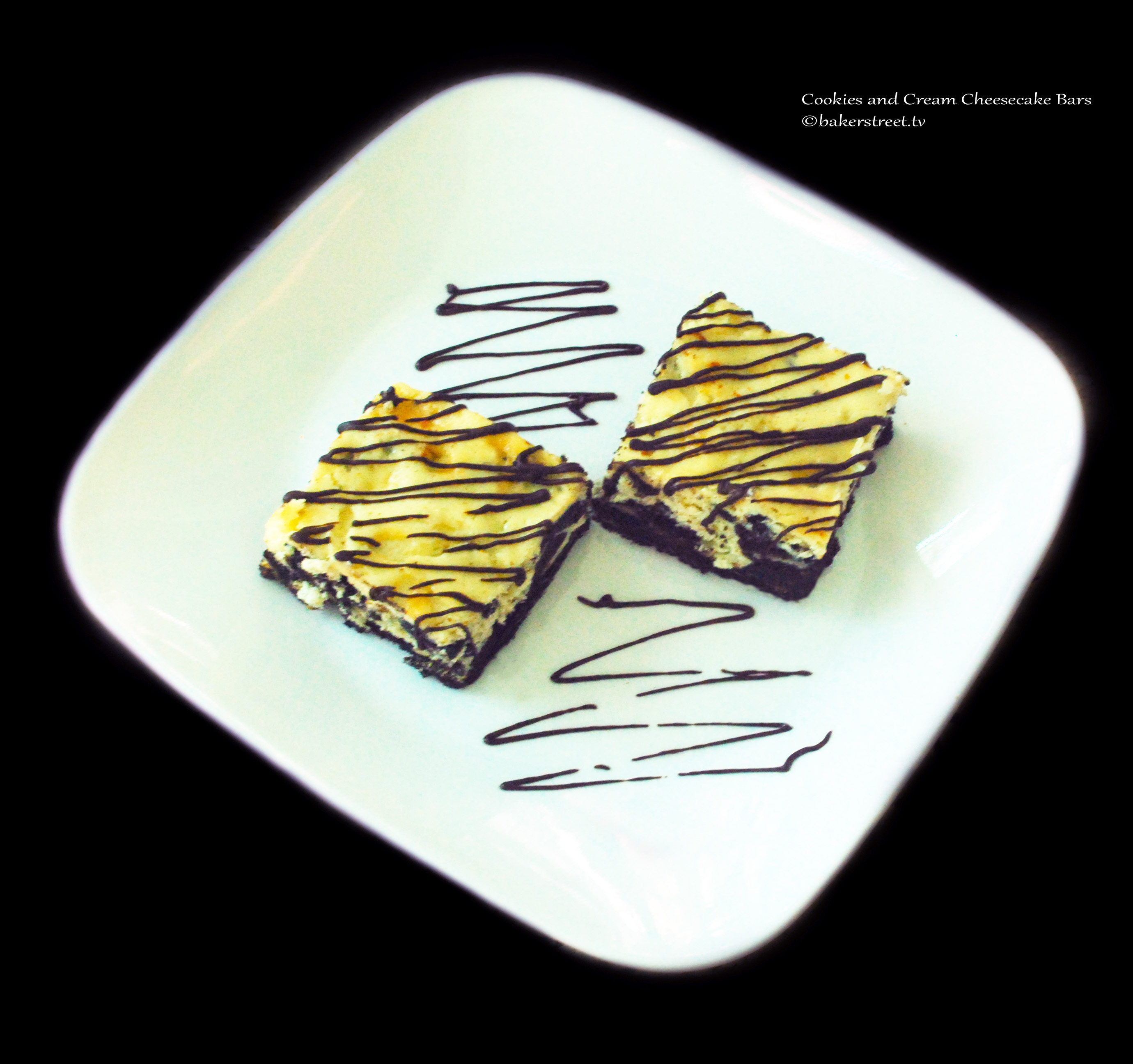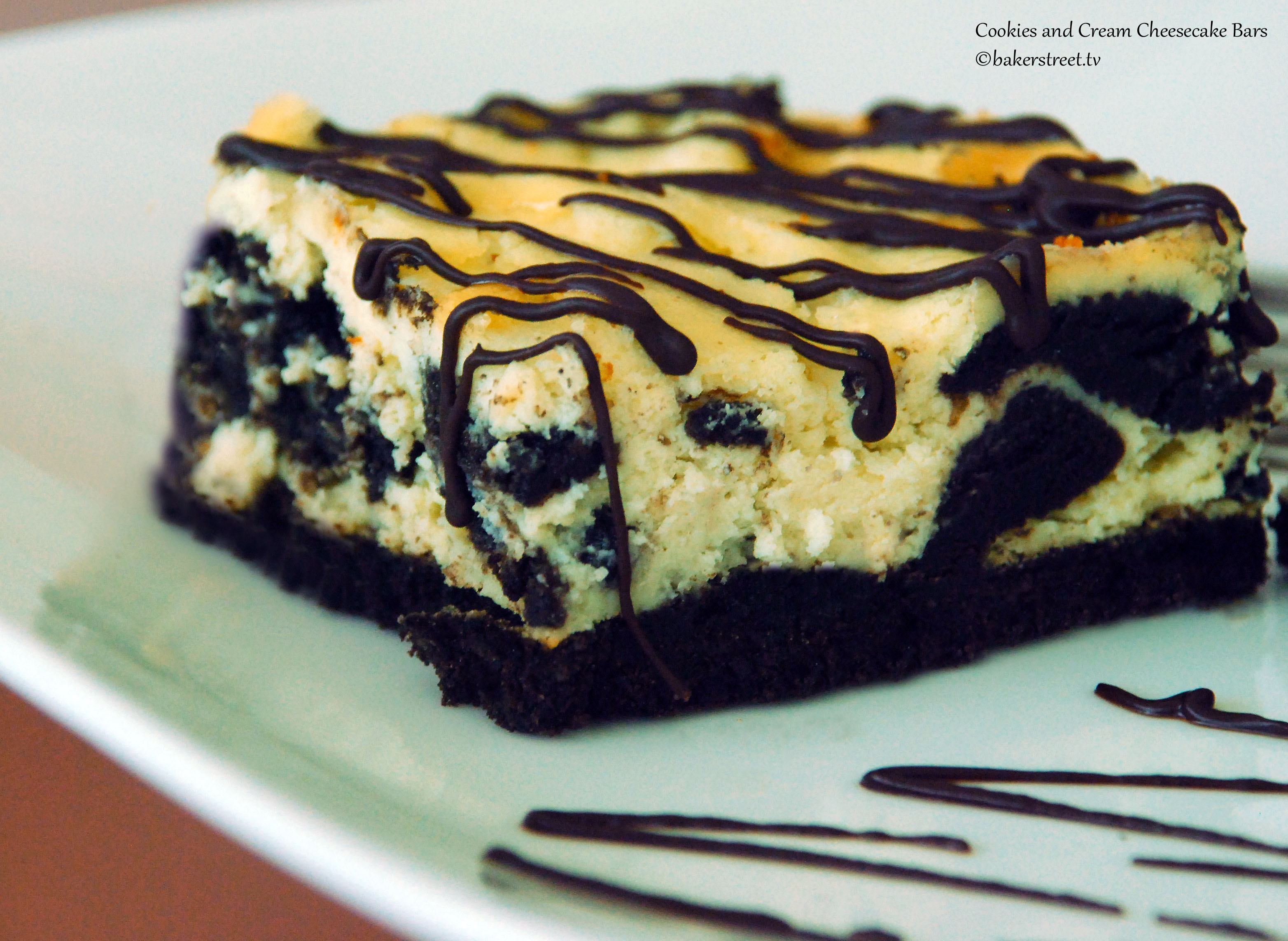 Oreo and butter. Mmmm… I knew the recipe was a keeper but the X factor of the double dose of Oreo cookies makes this dessert perfect and irresistible. The recipe comes together quickly and easily. Well, there is one tough part to get through: waiting for it to chill in the fridge. The cheesecake filling is not too sweet and that’s another aspect of the recipe I like. The bars can be cut in any size you like. I added a light drizzle of dark chocolate for dramatic effect.