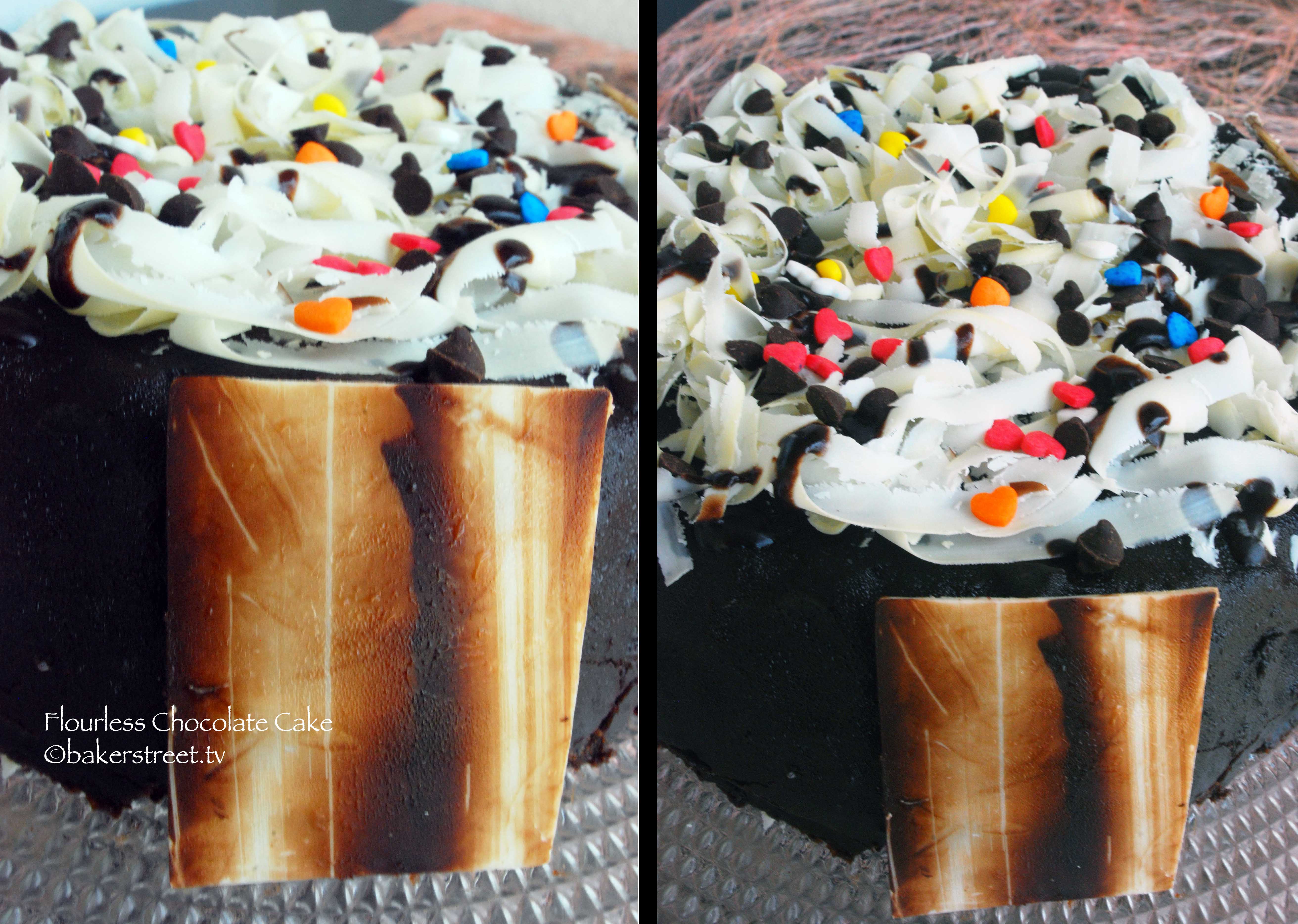 I recommend you serve thin slices of this cake. You can serve it with a raspberry sauce or a couple of cherries or a scoop of ice cream. I used all of the ganache on the cake saving 1 tablespoon then dressed it simply with a heap of white chocolate shavings, drizzled the leftover ganache, threw on a couple of chocolate chips and sugar hearts to give it the finish it richly deserves.