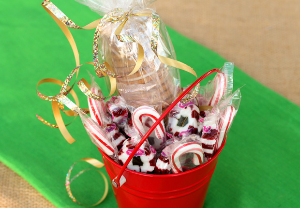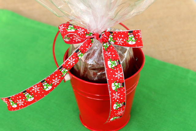 An easy way to add festive color when packaging cookies is to include Holiday candy around the cookies like in this little bucket….